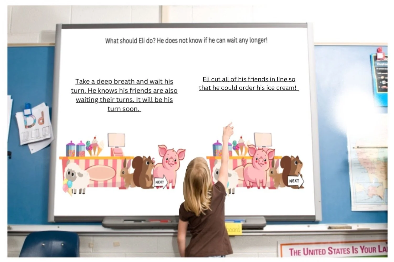 An Interactive Social Story is a story that depicts various social situations and will change to how the student is responding. If the student responds with an unexpected response, it will direct them to try again. They get a chance to learn and grow through each story practice! Each story will contain follow up questions.
